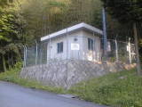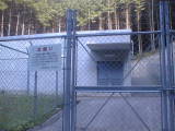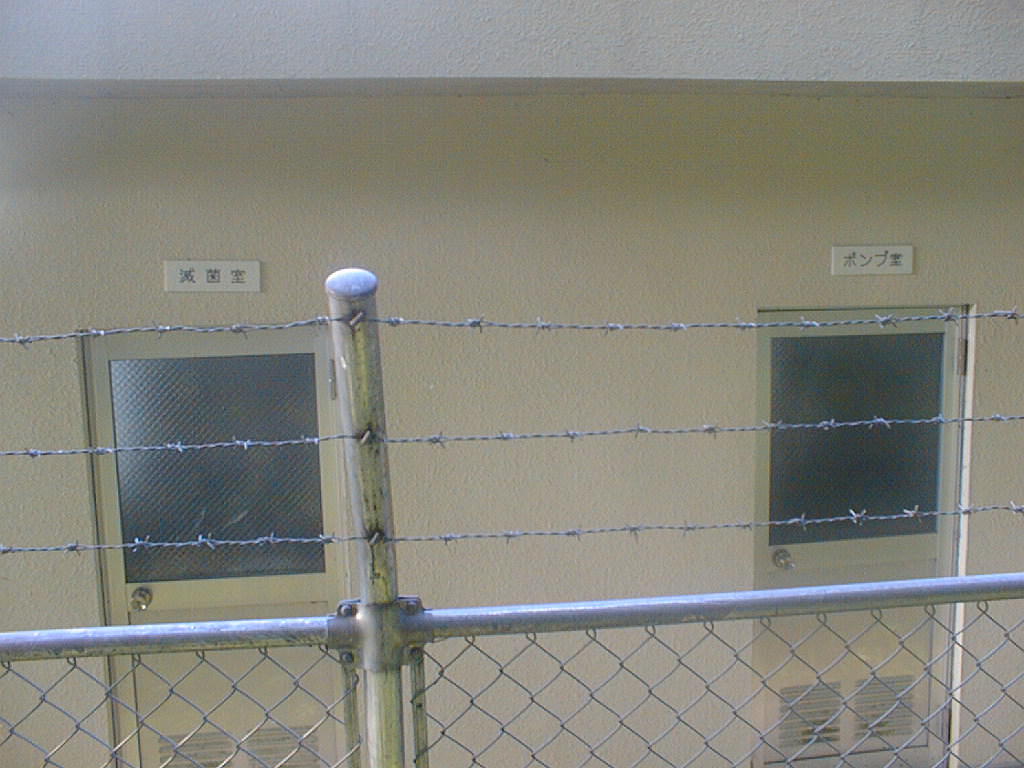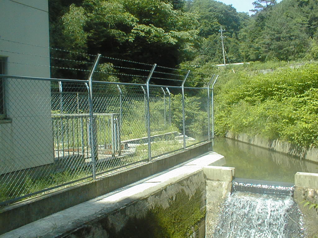 巴川の支流の百田川から水を取水します。建物はポンプ室で、浄水場へ水をくみ上げます。まわりには、人が入れないようにフェンスがやってあります。