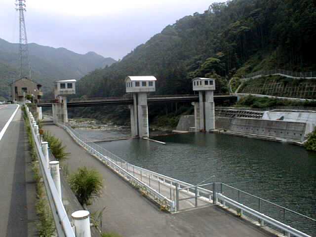 水力発電所用の取水口です。取水された川のようすをその前と比べてください。