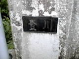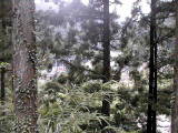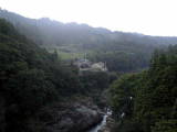 木の間から水力発電所の赤い看板が見えます。また、水力発電所への水路では多い水が滝のように落ちています。