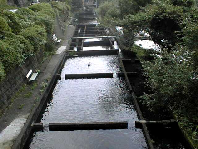 川の水を利用して魚の養殖(ようしょく)も行われています。